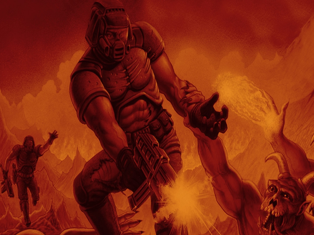 Description: A painting of a man with a gun in his hand and a demon in the background with a demon on his arm.