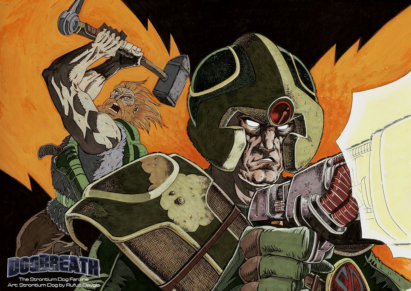 Description: A drawing of a man holding a gun and a dog on his shoulder with a fire behind him and a fire behind him.