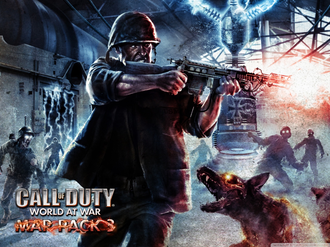 Description: A man holding a gun in front of a dog and a machine gun in the air with a group of zombies in the background.