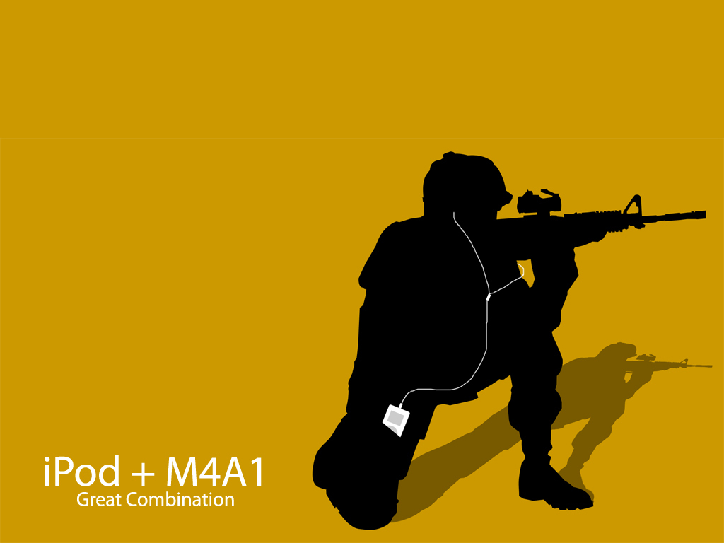 Description: A man with a gun and headphones on a yellow background with the words ipod + ma 1 great combination.