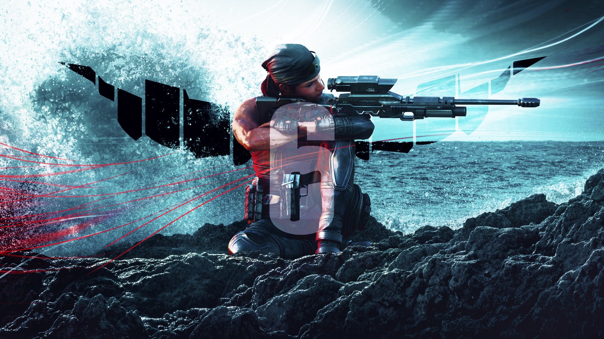 Description: A man with a gun is sitting on a rock near the ocean and a wave is crashing behind him.