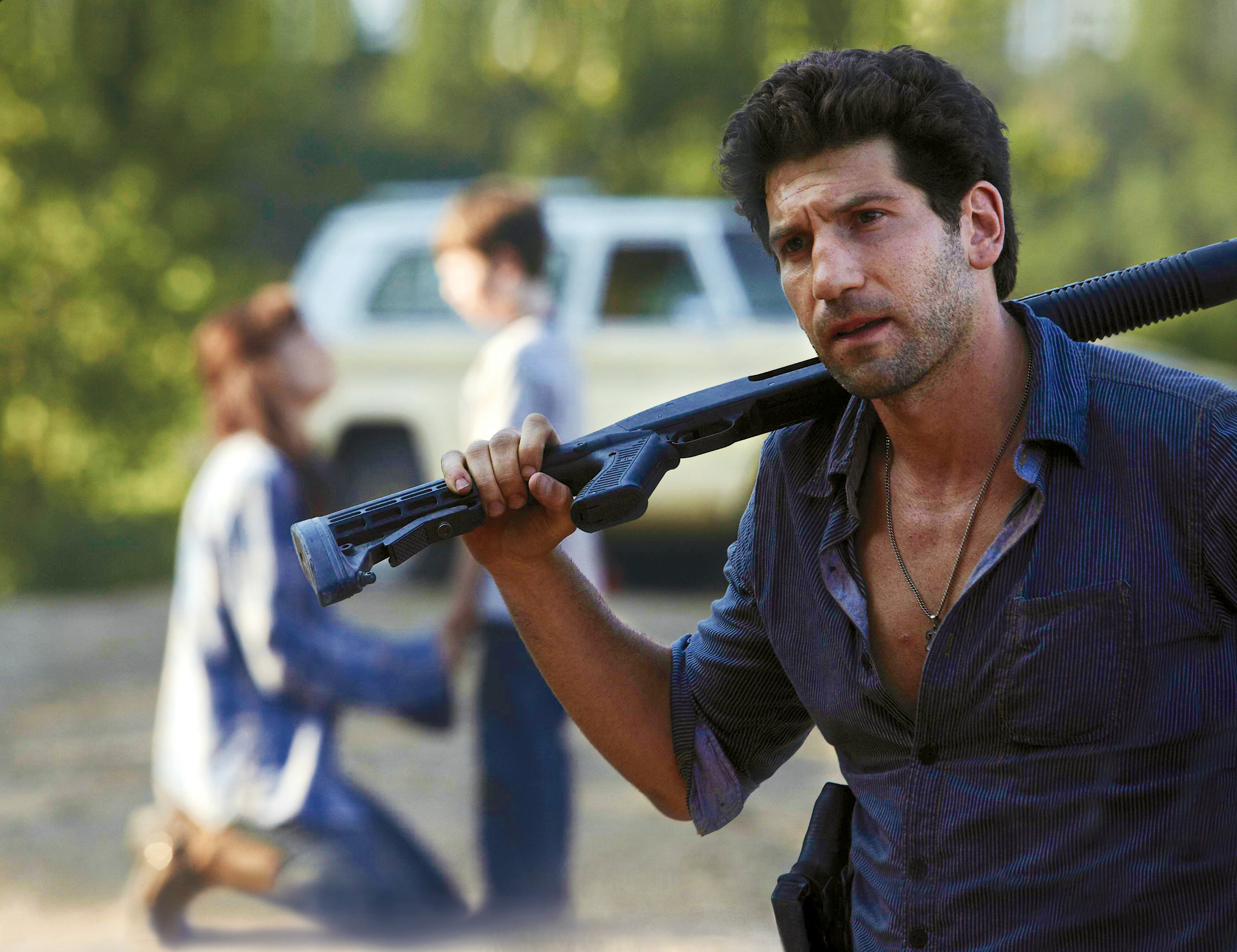 Description: A man holding a gun in his hand while another man runs behind him with a truck behind him and a woman behind him.