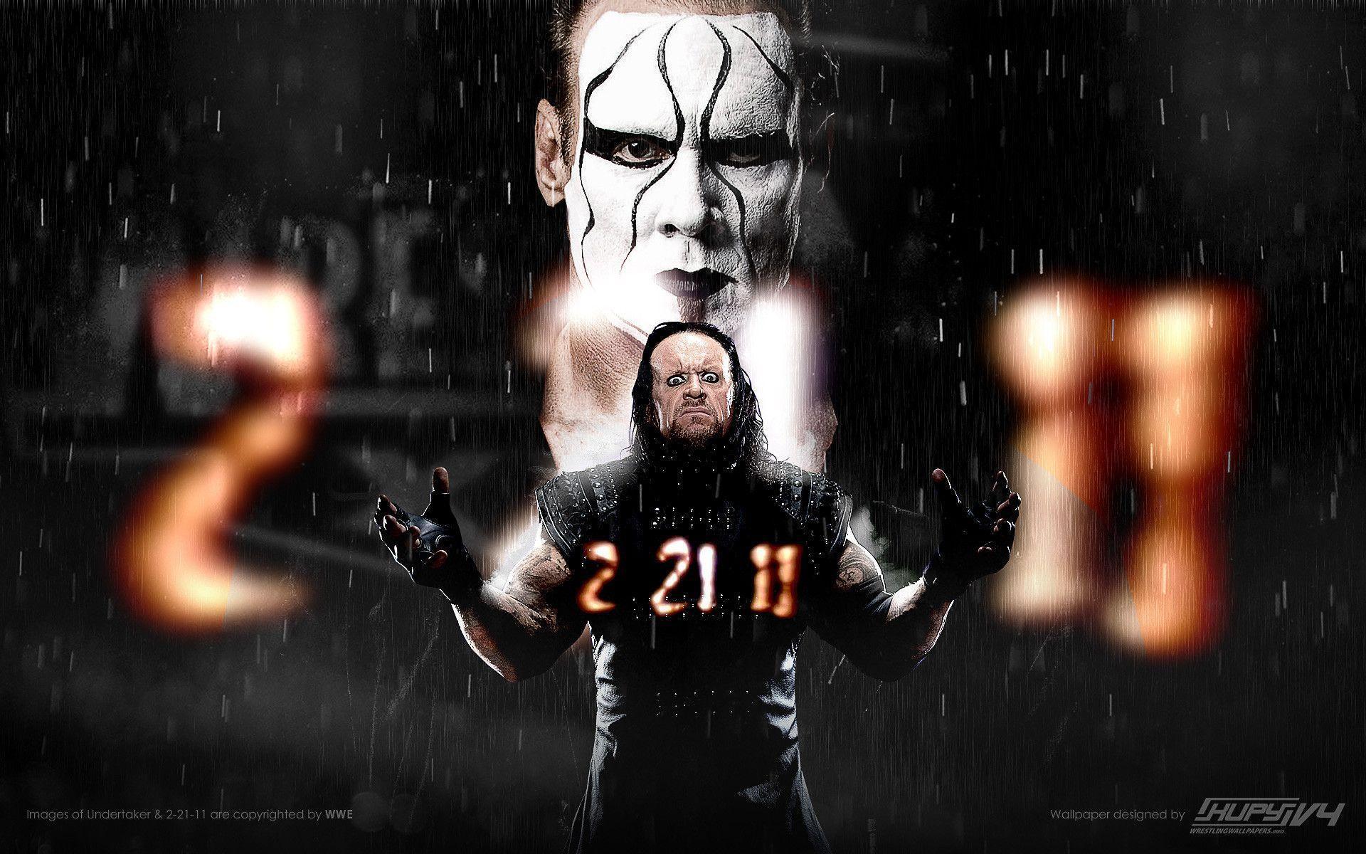 Description: A man with his hands up in the air in front of a poster of a wrestler with his arms out.
