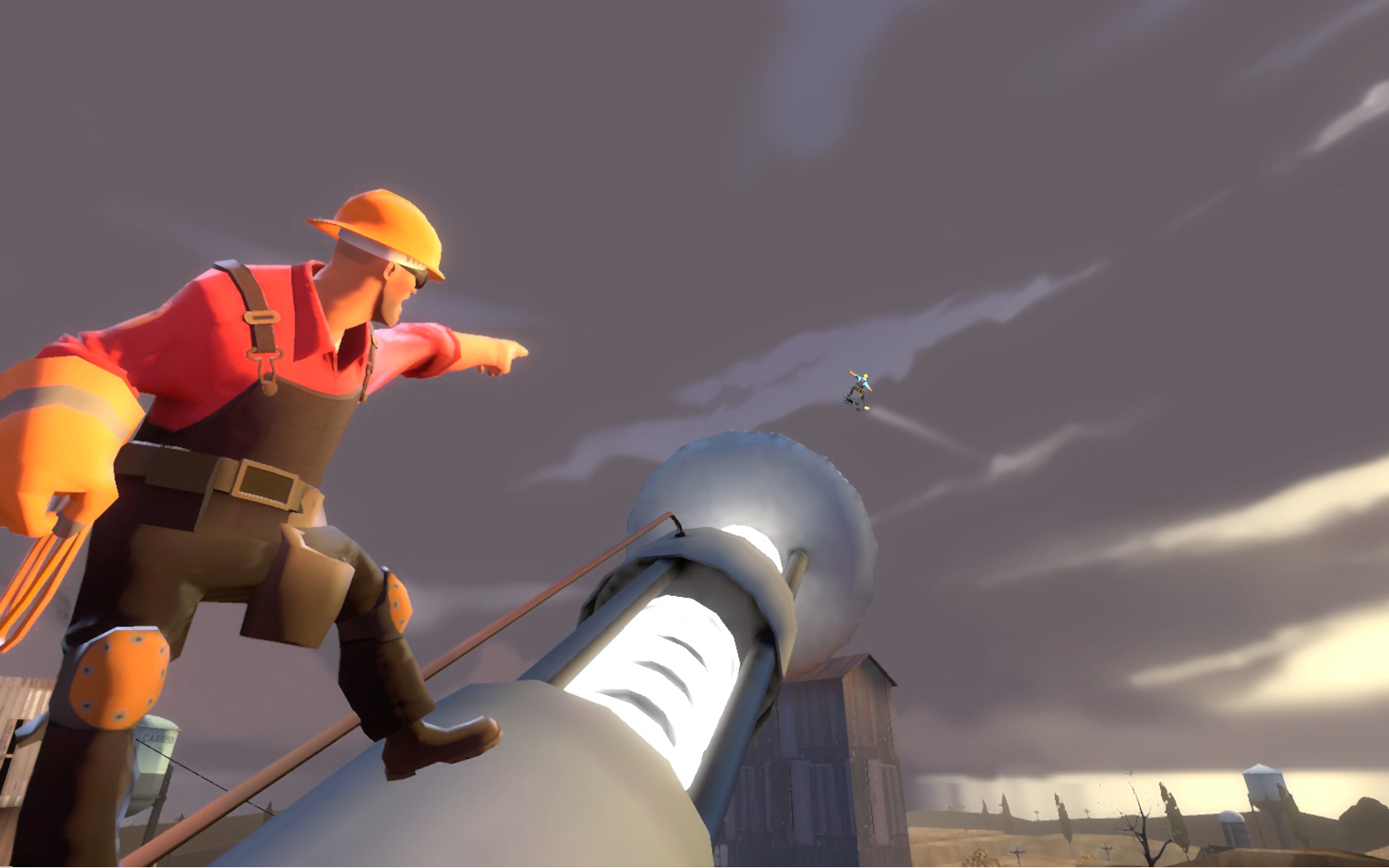Description: A man in a hard hat is on a pipe and is pointing at something in the distance with a sky background.