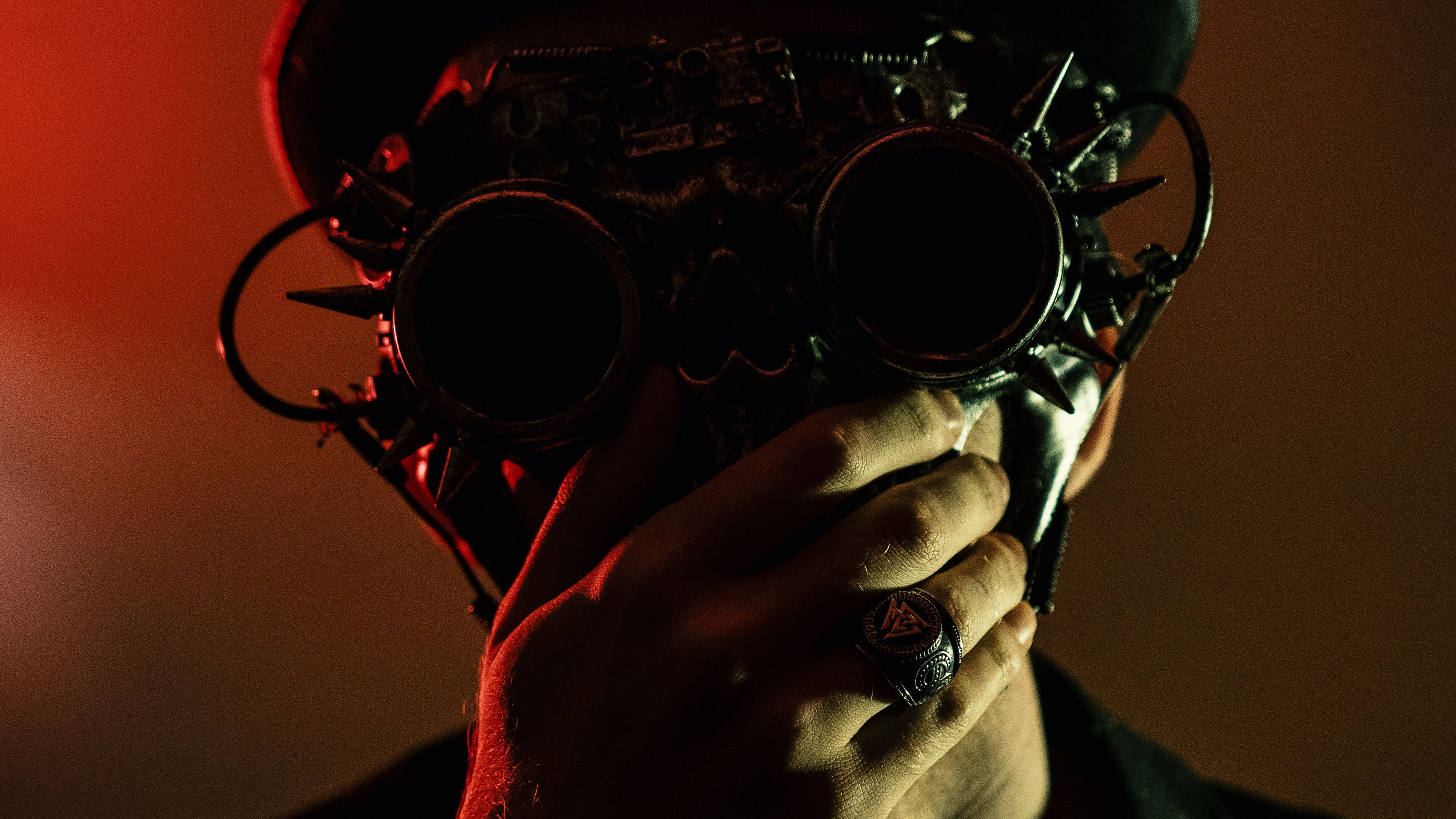 Description: A man wearing a hat and holding a pair of binoculars to his face with both hands and a red light behind him.