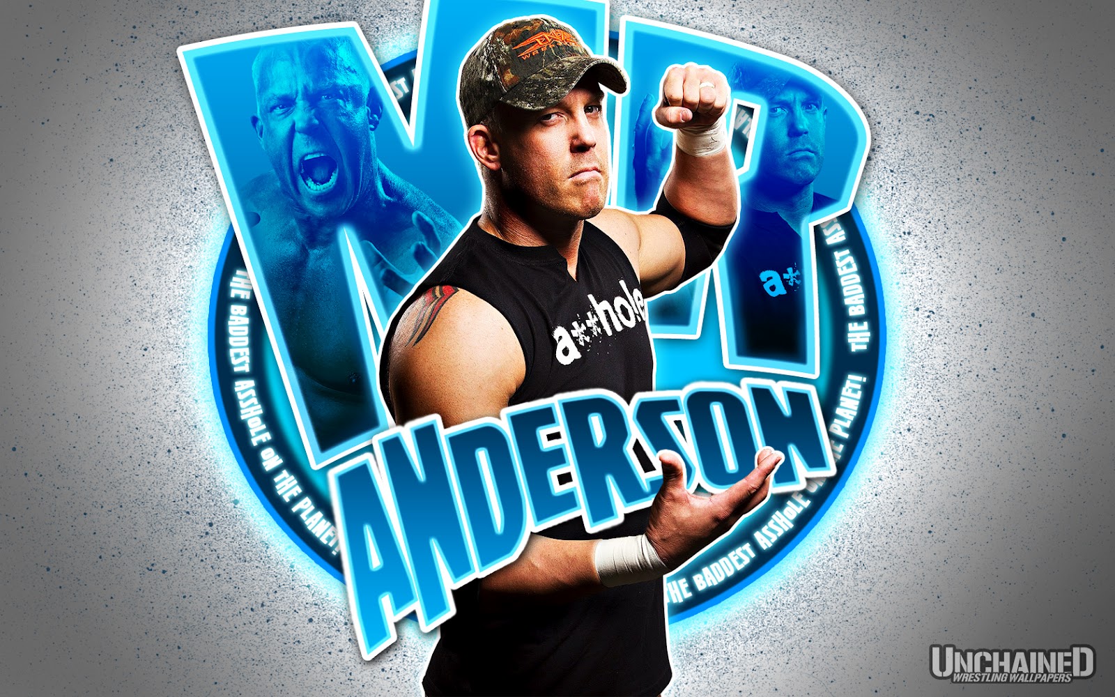 Description: A man in a hat and black shirt with his fist up in the air and the words anderson on it.