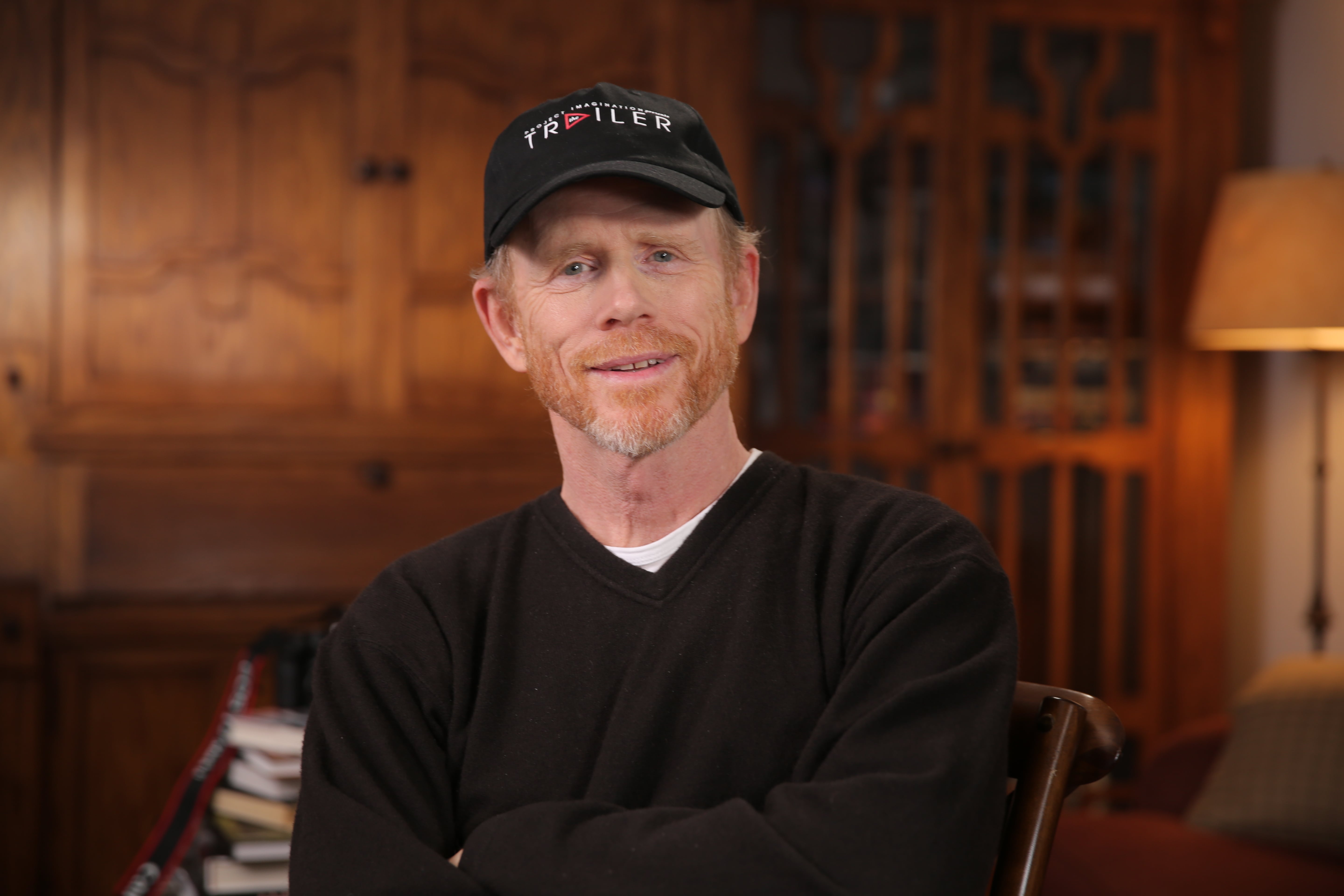 Description: A man with a hat on sitting in a chair in a room with wooden walls and a lamp on the side.