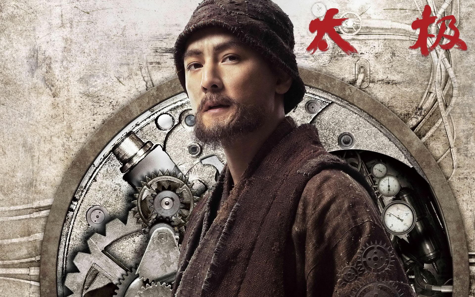 Description: A man with a hat and a coat on standing in front of a clock with chinese characters on it.
