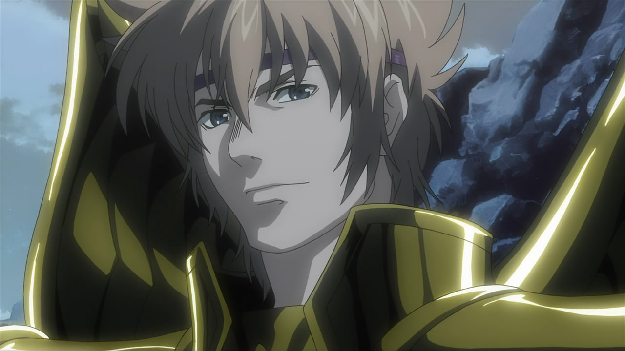 Description: A man with a hat and a green coat on his head and a sky background with clouds and rocks.