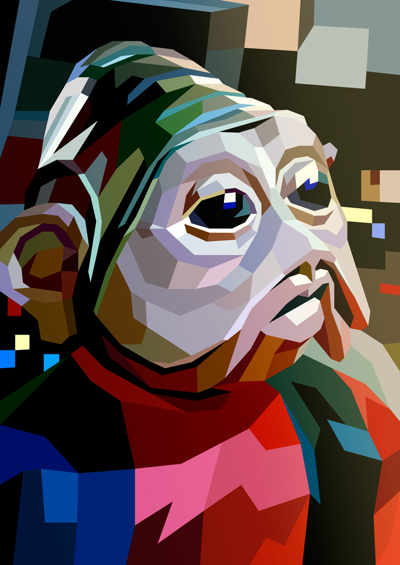 Description: A painting of a man with a hat on his head and a red shirt on his body and a black background.