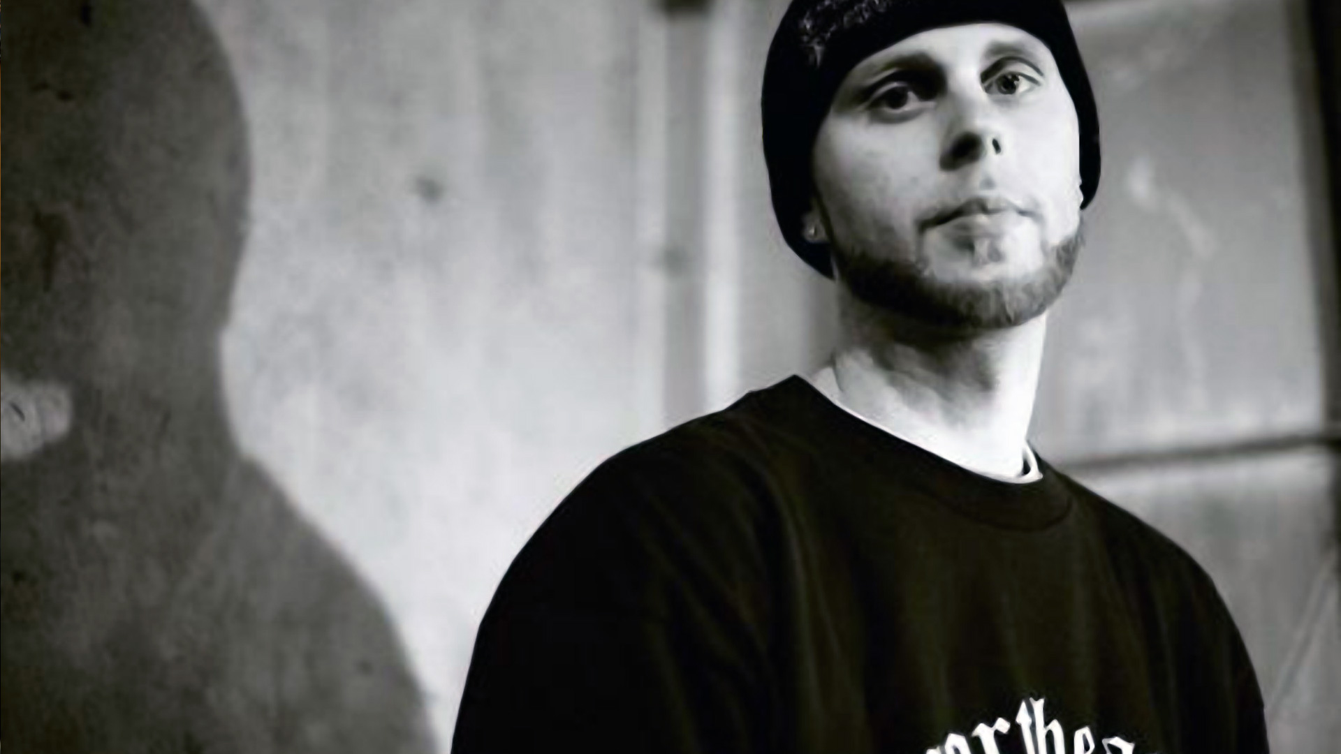 Description: A man with a hat on standing in front of a wall with a shadow of a man on it.