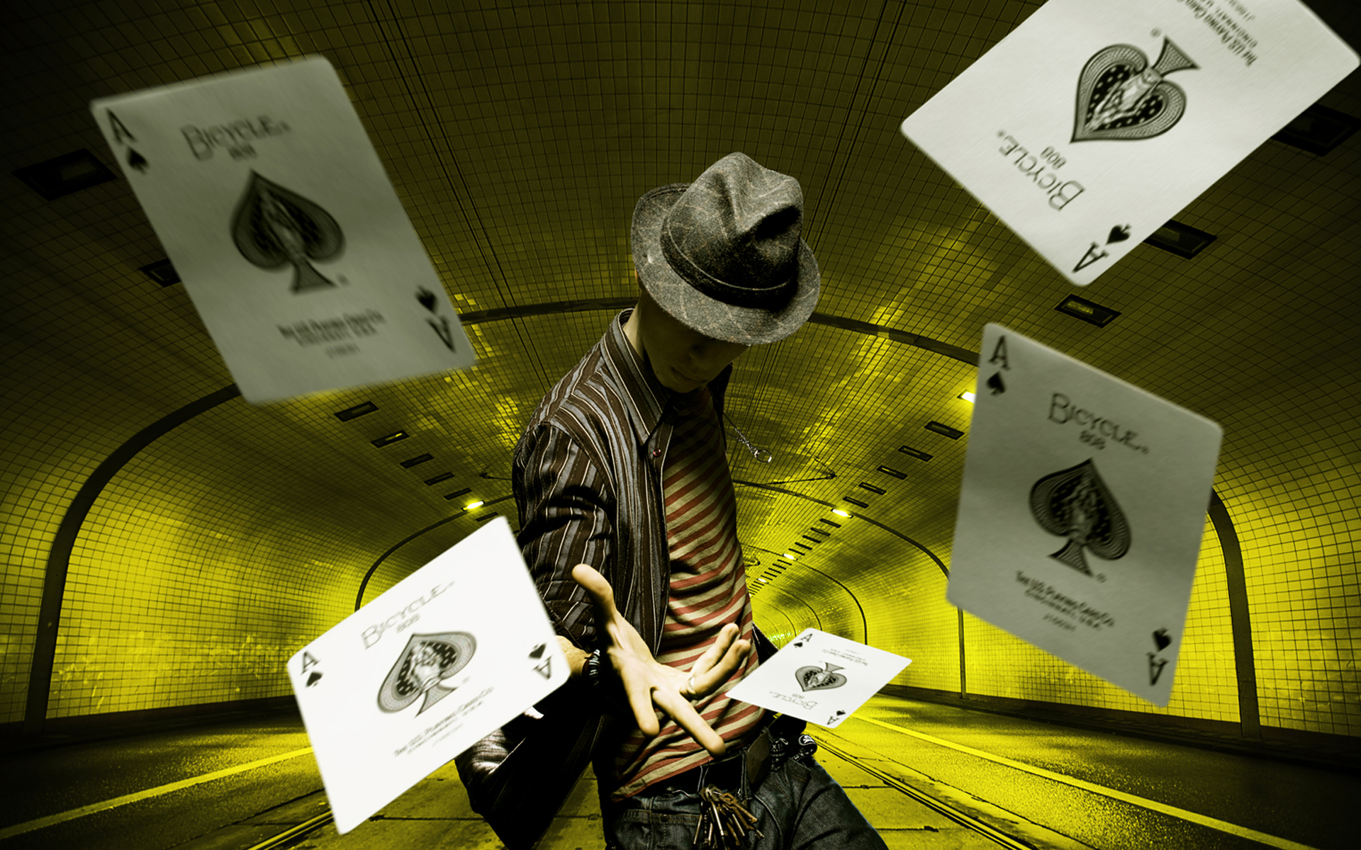 Description: A man in a hat and striped shirt holding cards in a tunnel with a lot of cards flying around.
