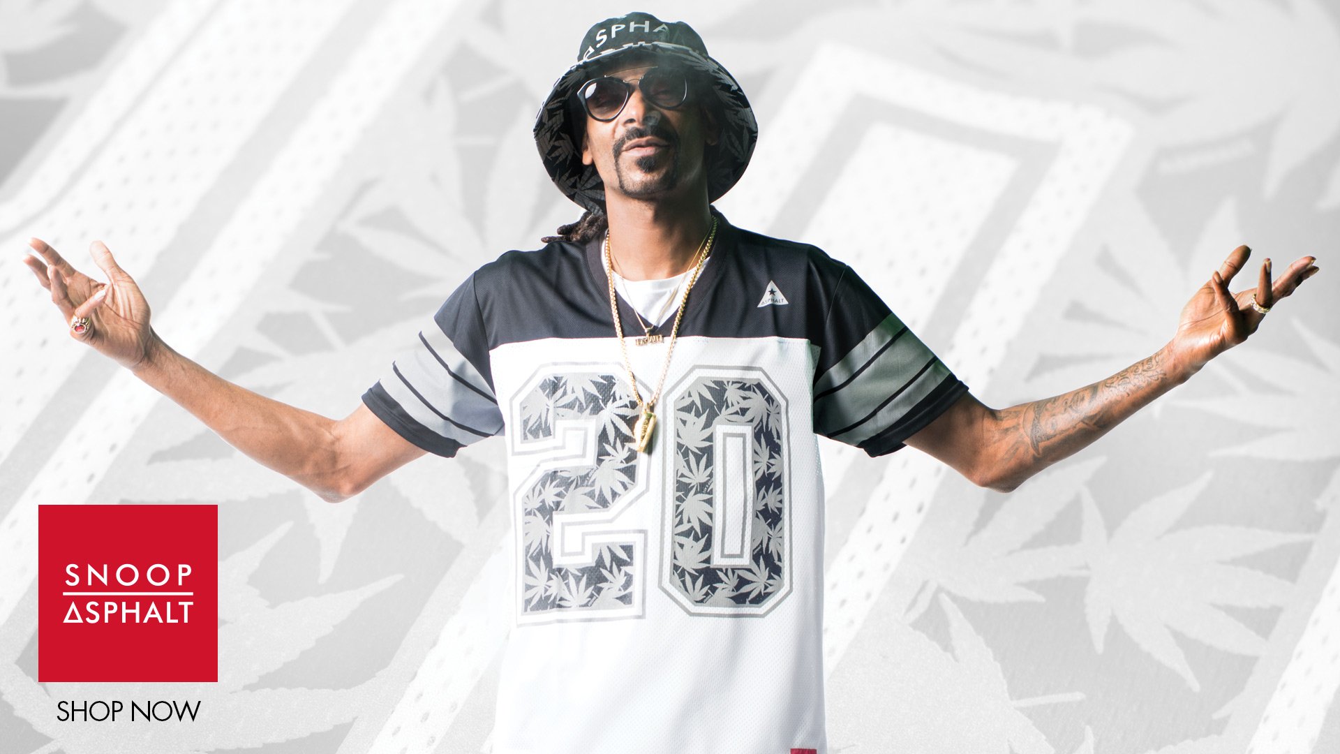 Description: A man wearing a hat and sunglasses with his arms out in front of him and a red and white background.
