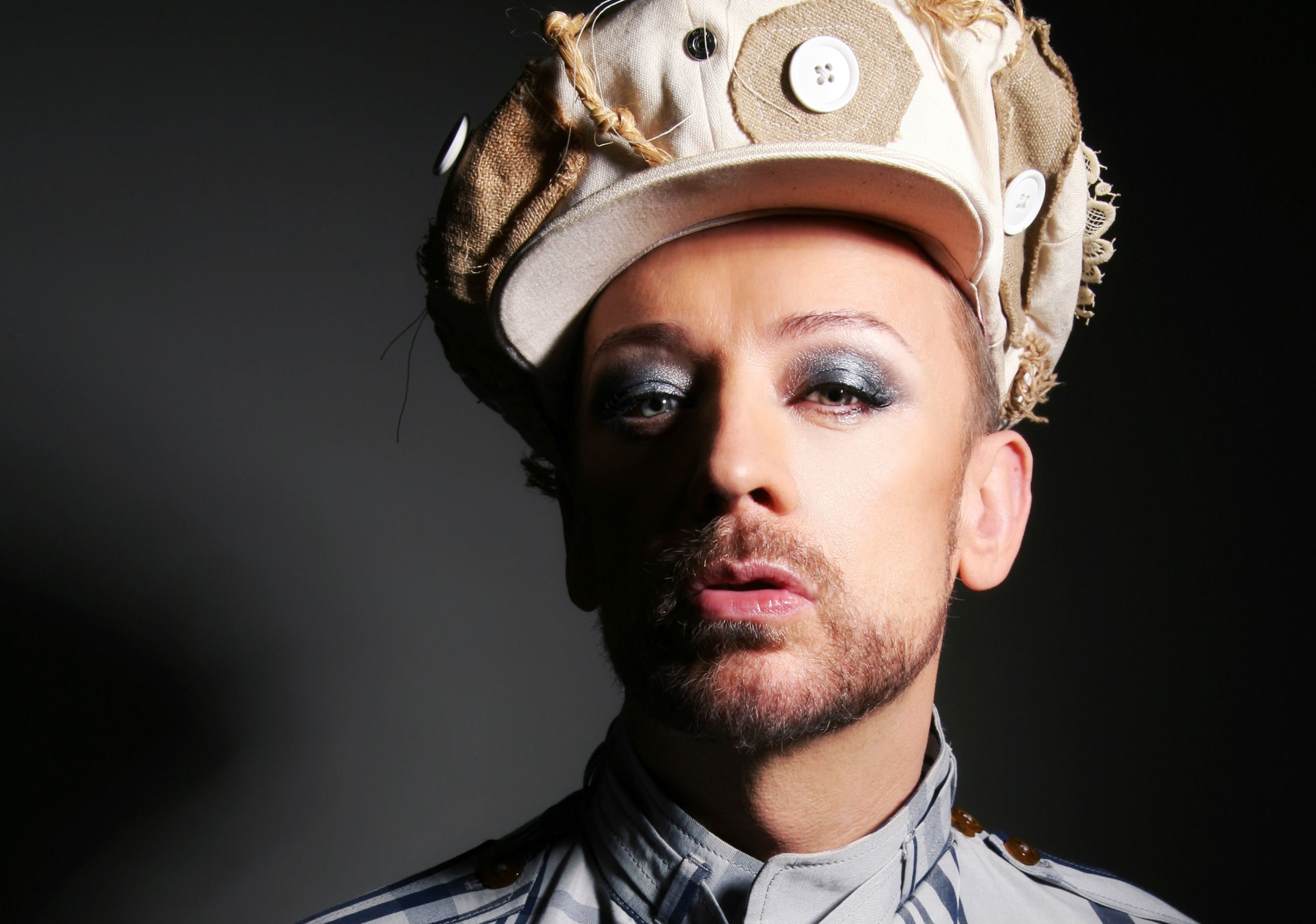 Description: A man with a hat and a tie on his head and a button on his shirt and tie on his shirt.