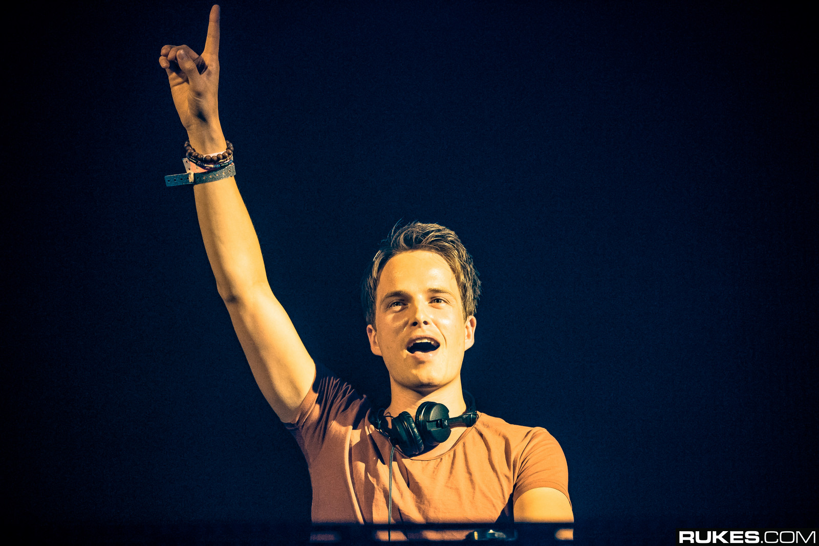 Description: A man with headphones on holding up his hand in the air with his right hand up in the air.