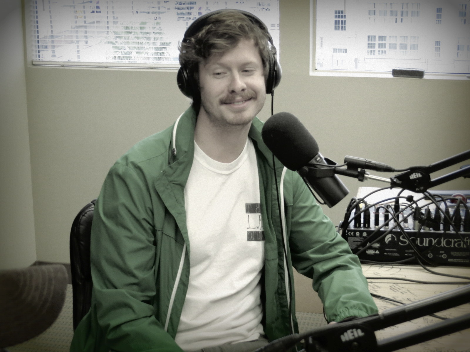 Description: A man sitting in front of a microphone wearing headphones and a green jacket with a white shirt on.