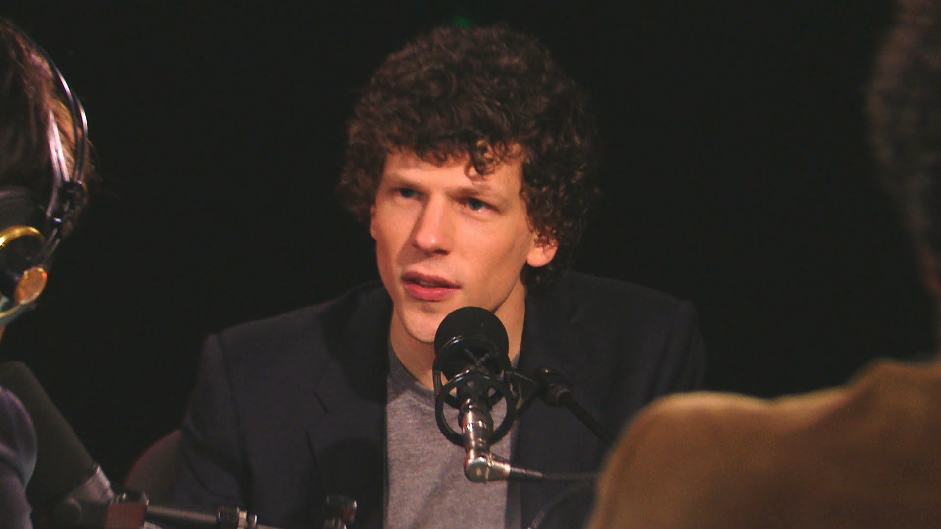 Description: A man with headphones on talking to a microphone in front of a man with a microphone in his hand.