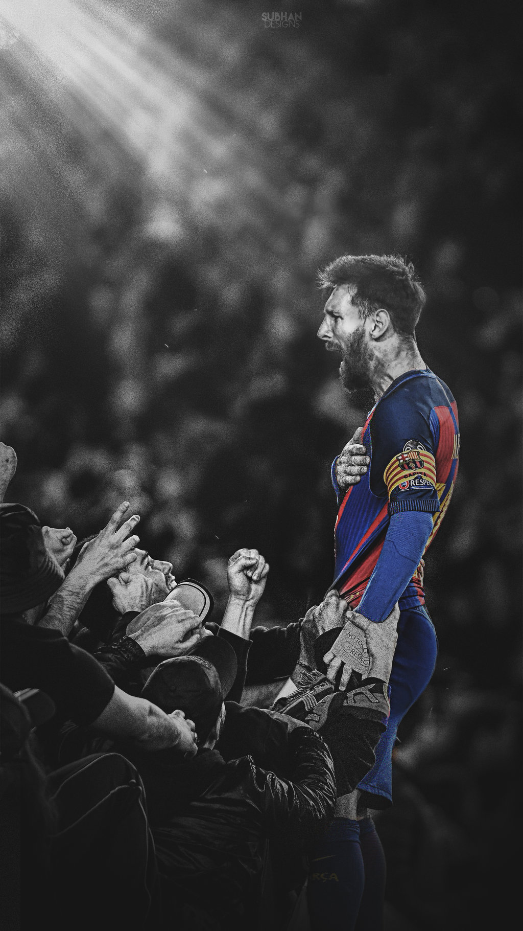 Description: A man is being held by a group of people in a stadium with a light shining down on him.