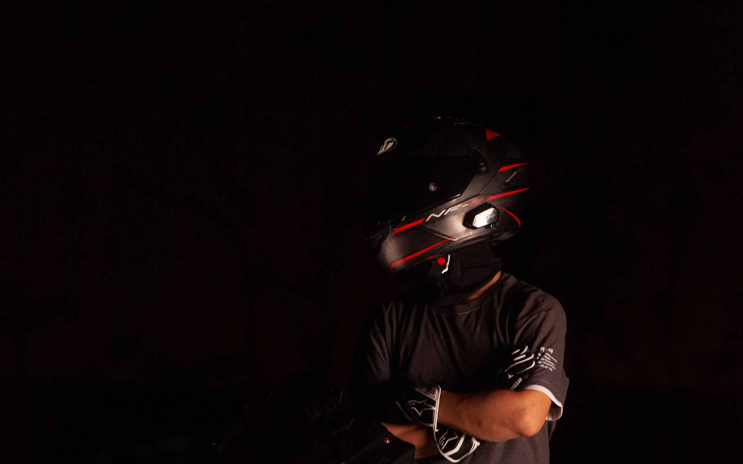 Description: A man wearing a helmet and holding a baseball bat in his hands at night time with a dark background.