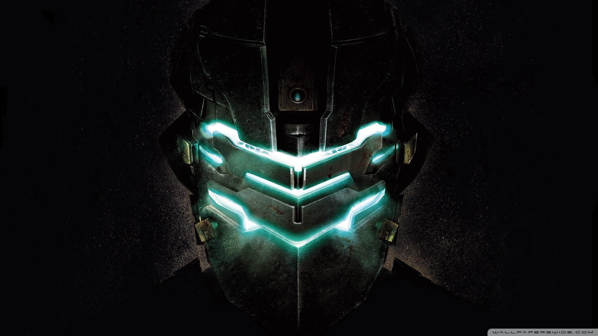 Description: A man in a helmet with glowing lights on his face and a black background with a green light coming from the side.