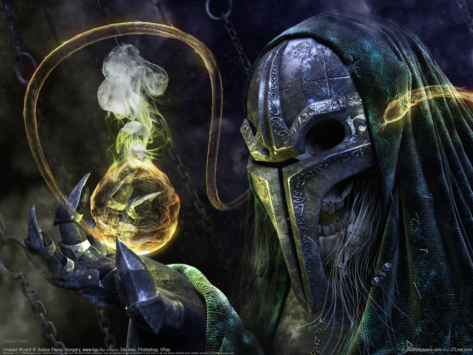 Description: A man in a helmet holding a glowing orb in his hand and a chain around his neck.