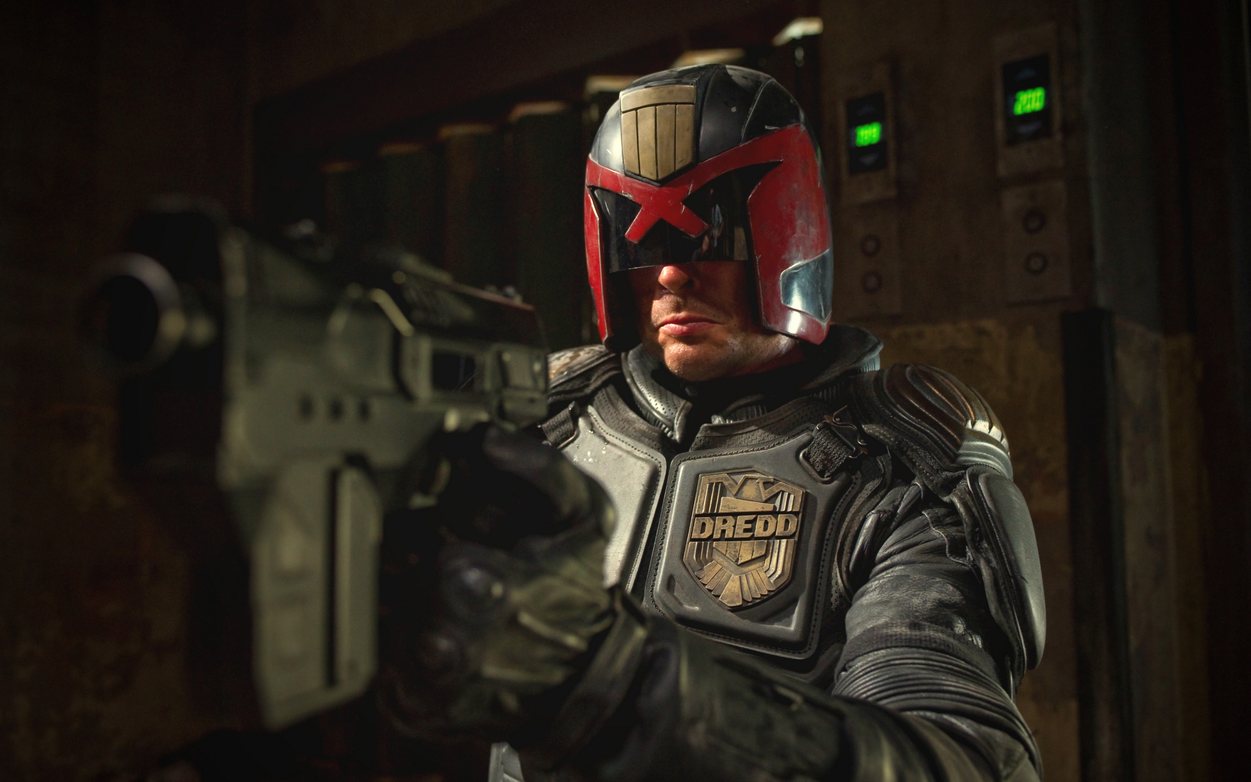 Description: A man in a helmet holding a gun in a room with a green light on the wall behind him.