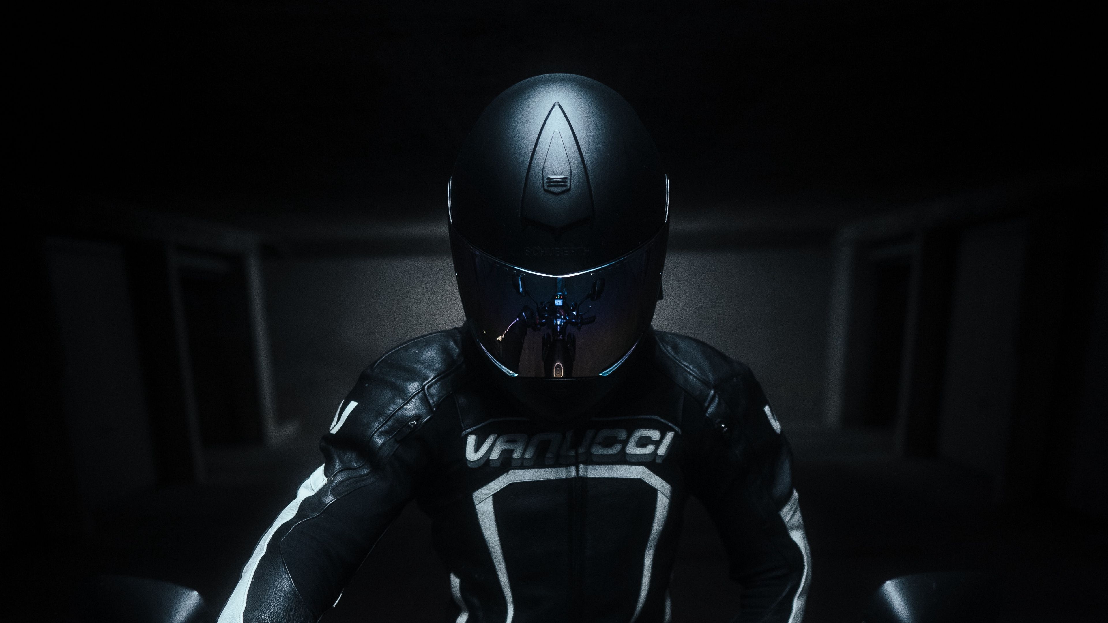Description: A man in a black and white suit and helmet in a dark room with a motorcycle helmet on his head.