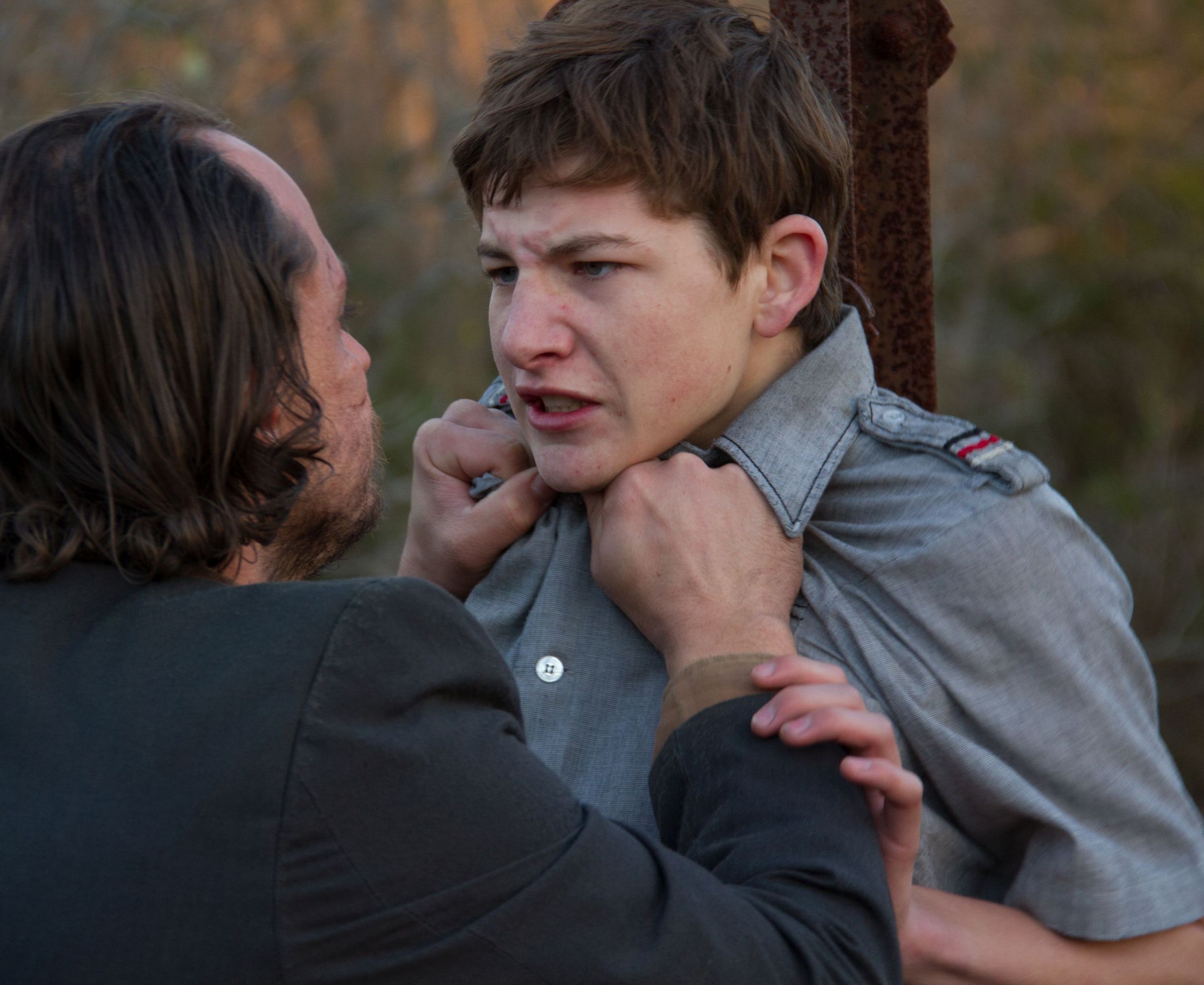 Description: A man helping another man fix his tie on his neck in a wooded area of the woods.