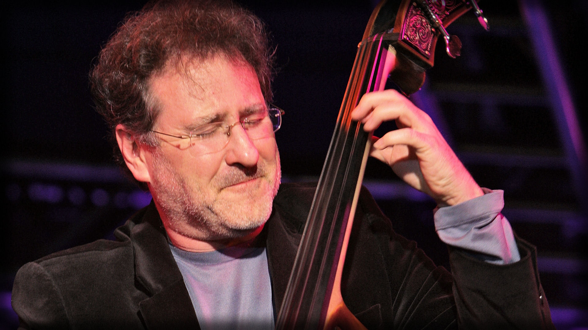 Description: A man holding a bass in his right hand and looking at the camera with a serious look on his face.
