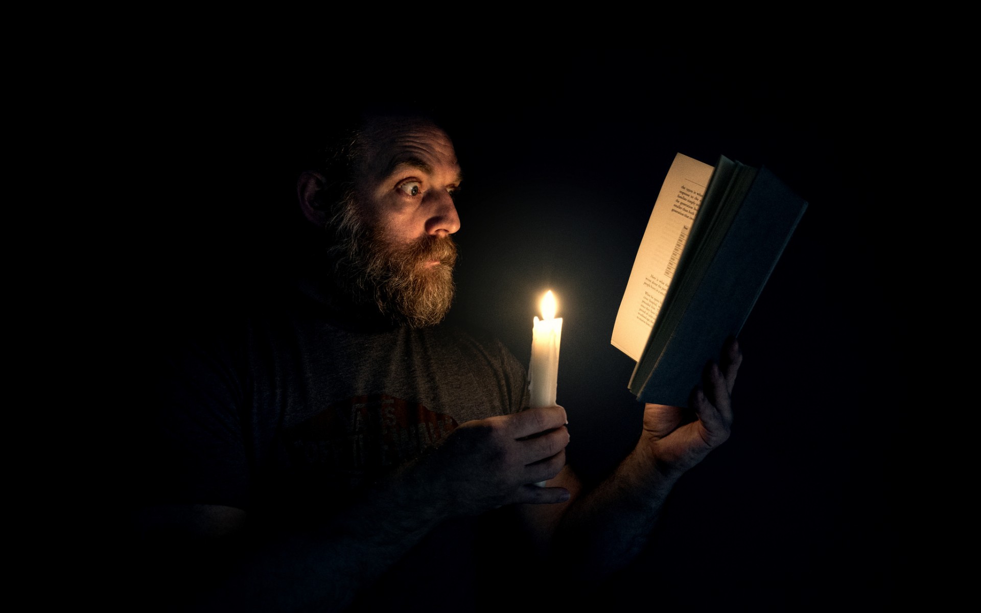 Description: A man holding a book and a candle in his hand in the dark with a book in his hand.