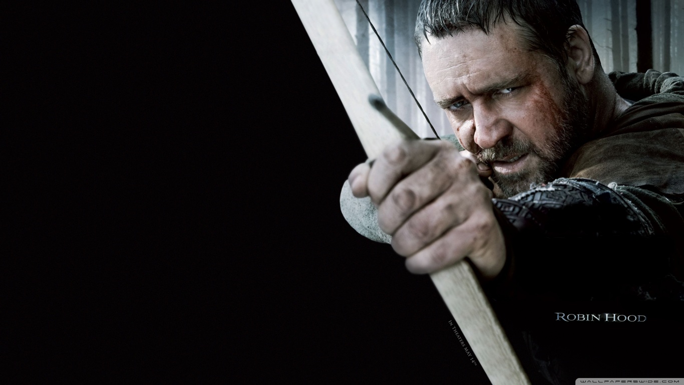Description: A man holding a bow and arrow in his hand while looking at the camera with a serious look on his face.