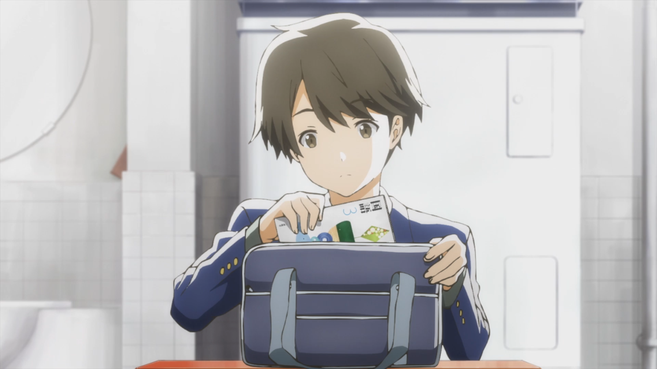 Description: A man holding a briefcase in a bathroom with a toilet in the background and a sink in the background.
