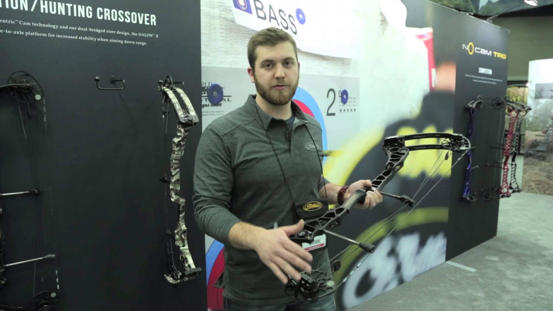 Description: A man holding a camera in front of a display of some kind of equipment on display at a trade show.