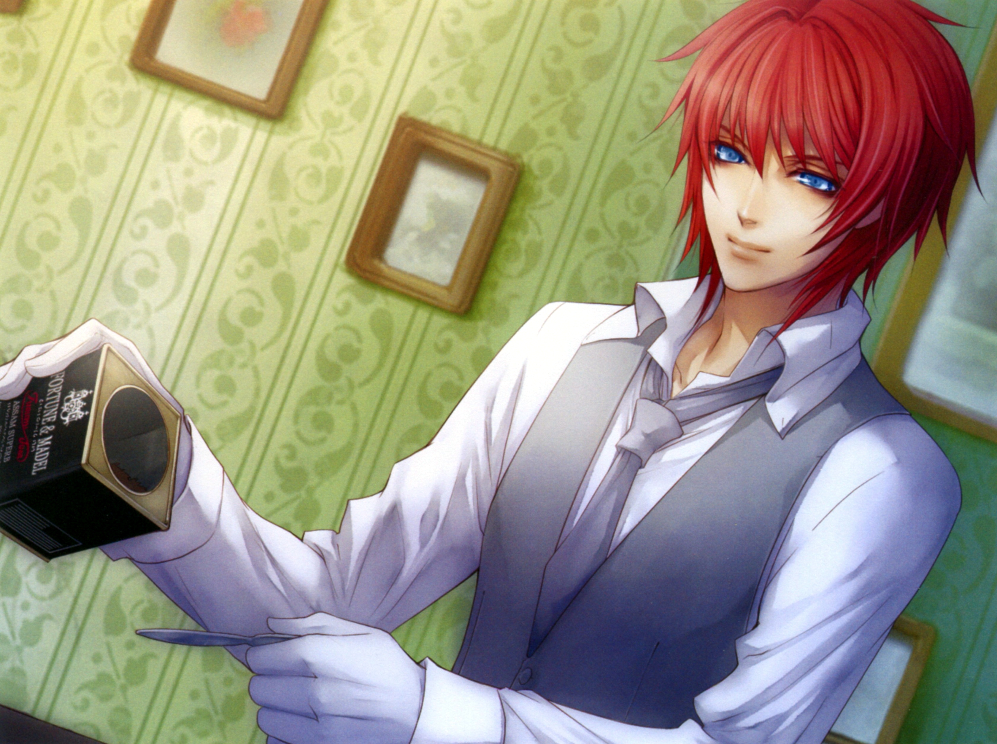 Description: A man holding a camera in a room with green walls and a green wallpapered wall with pictures.