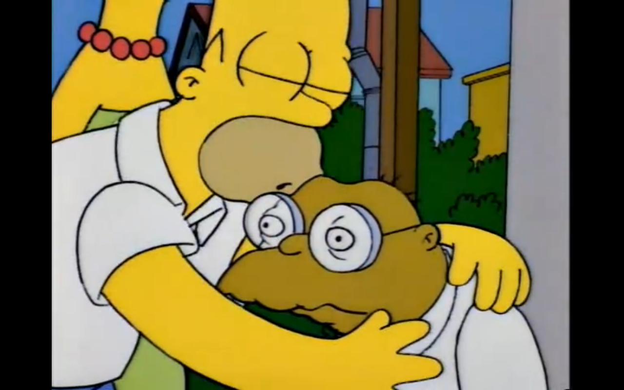 Description: A man is holding a large head of a cartoon character in a cartoon scene with a woman in the background.