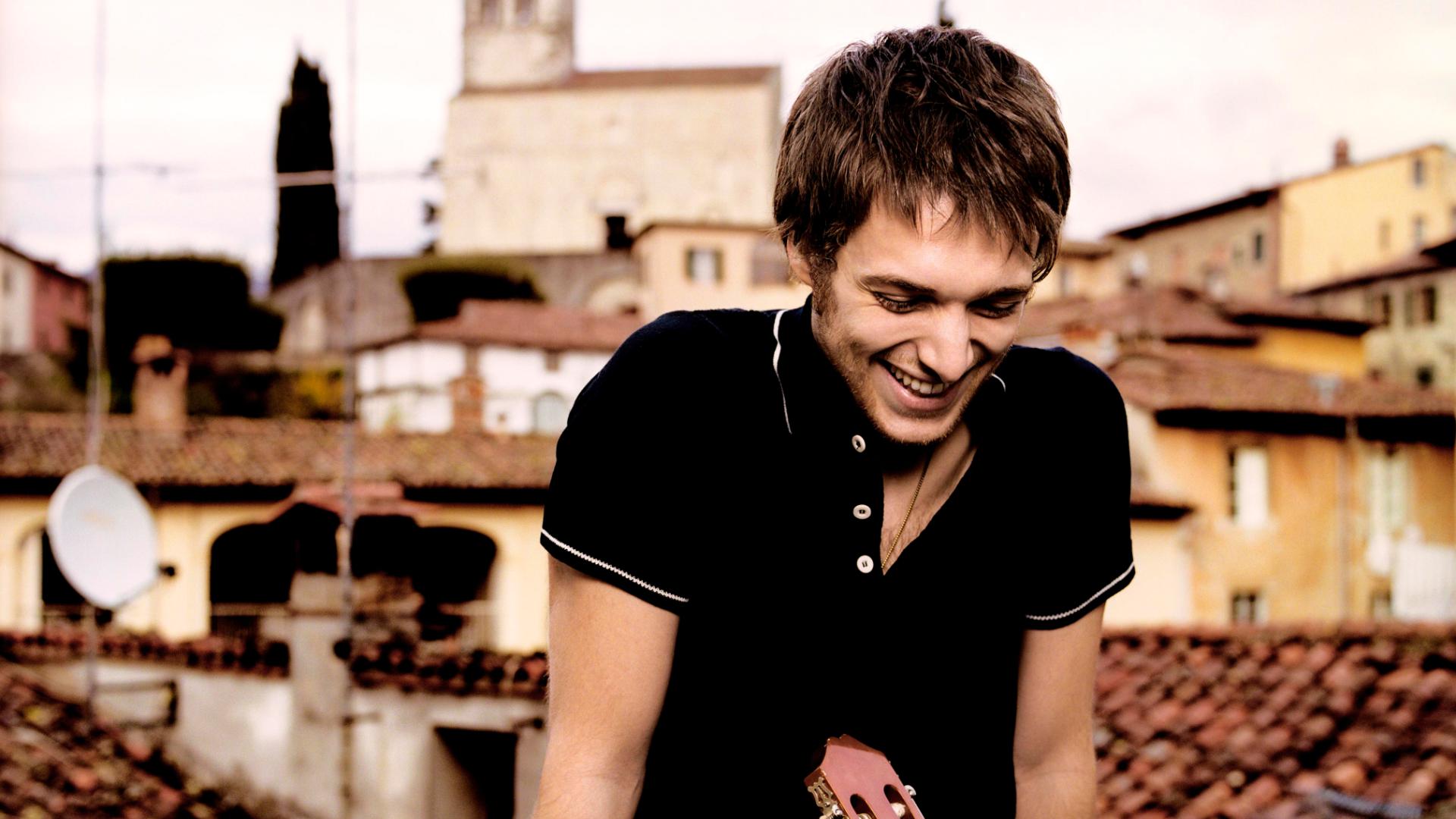 Description: A man holding a cell phone in his hand and smiling at the camera with a city in the background.