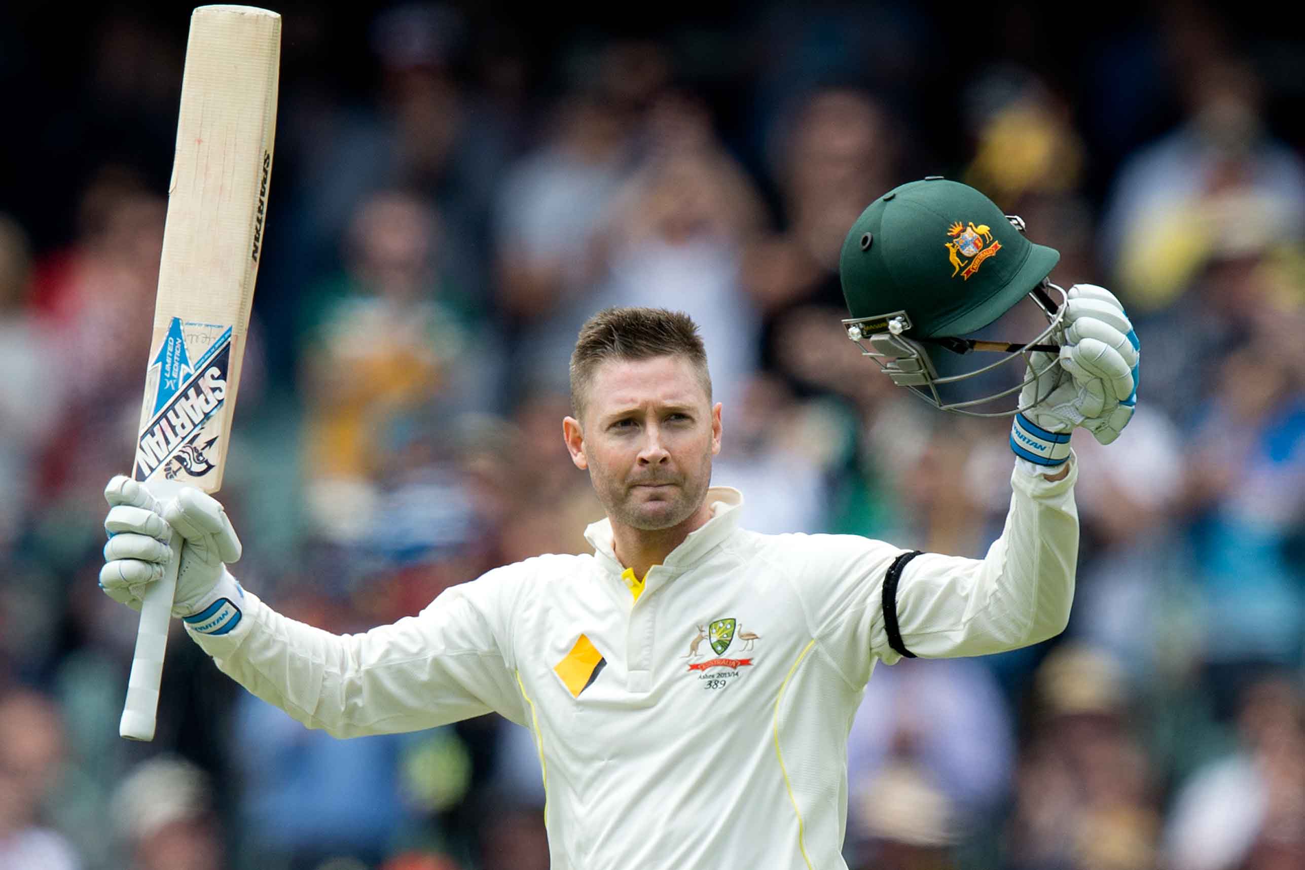 Description: A man holding a cricket bat and helmet in his hands while wearing a green helmet and holding a green and white ball.