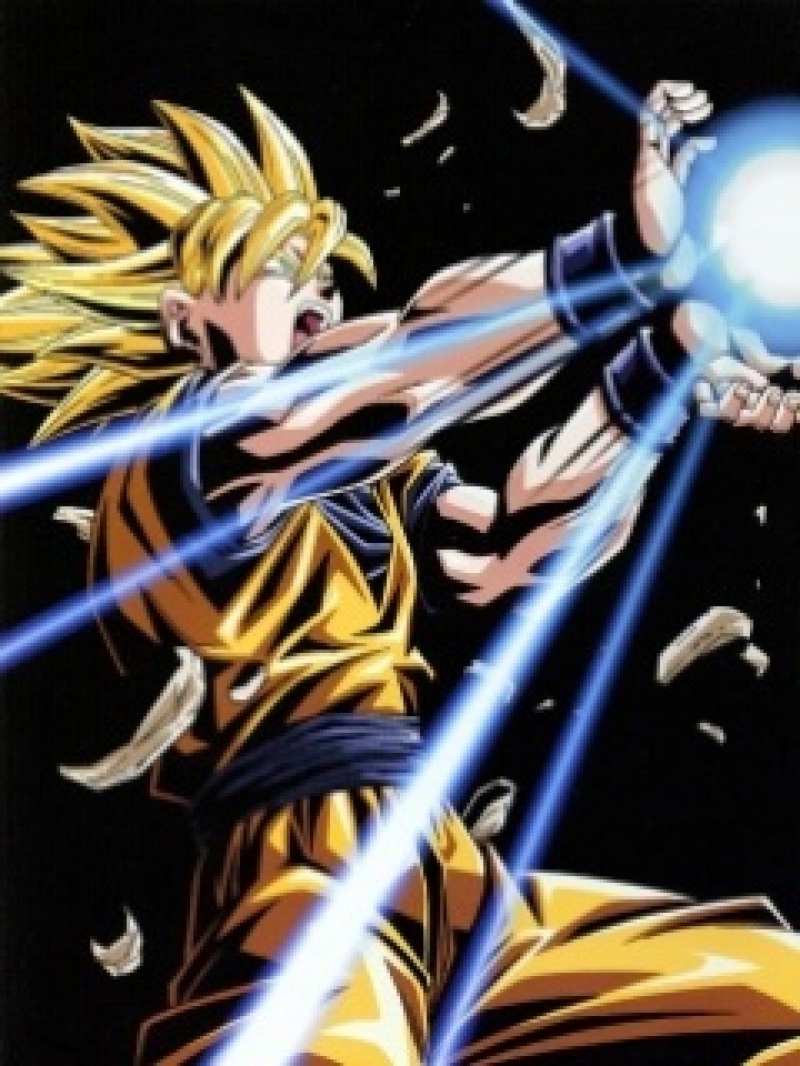 Description: A man holding a glowing ball in his hand with two blue lights coming out of it and a black background.