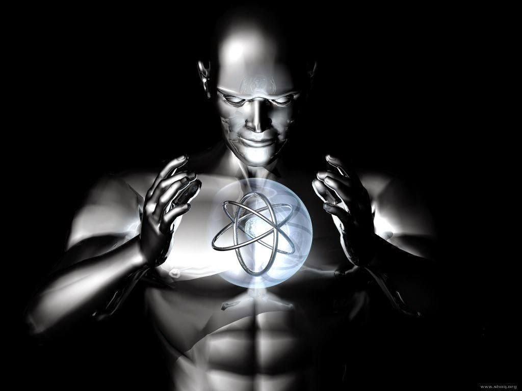 Description: A man holding a glowing object in his hands in the dark with a glowing object in his chest and hands.