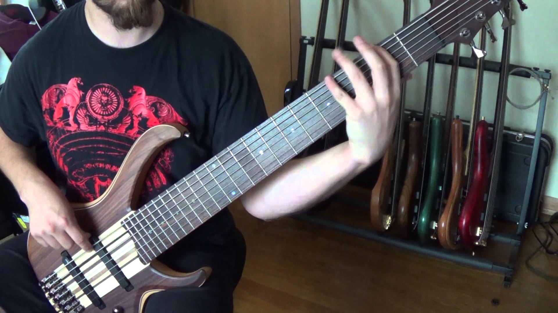 Description: A man holding a guitar in his hands in a room with guitars and other musical equipment on the wall.