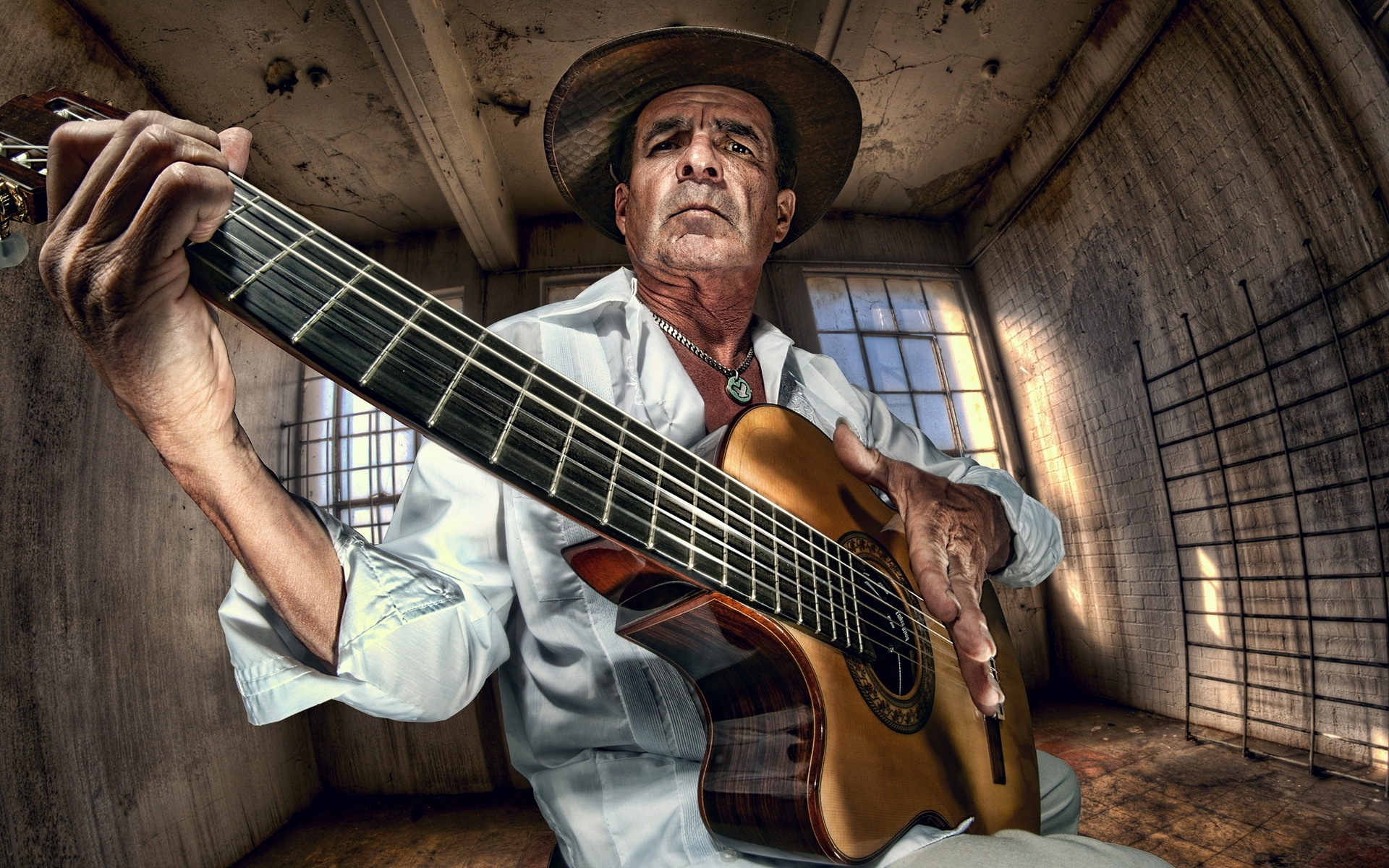 Description: A man holding a guitar in a room with a window and a wall behind him is a window and a brick wall.