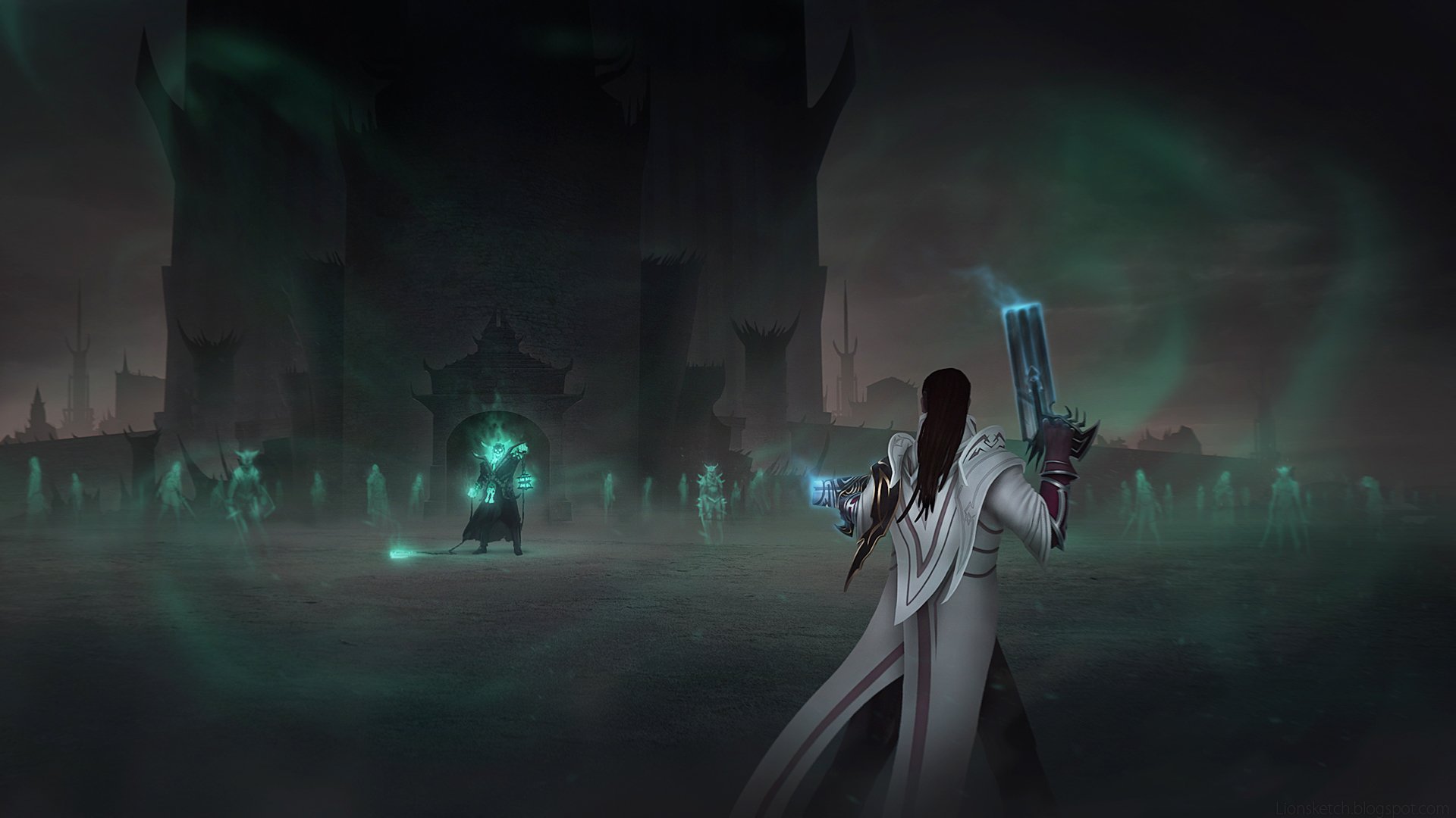 Description: A man holding a gun in a dark area with green lights on it and a castle in the background.