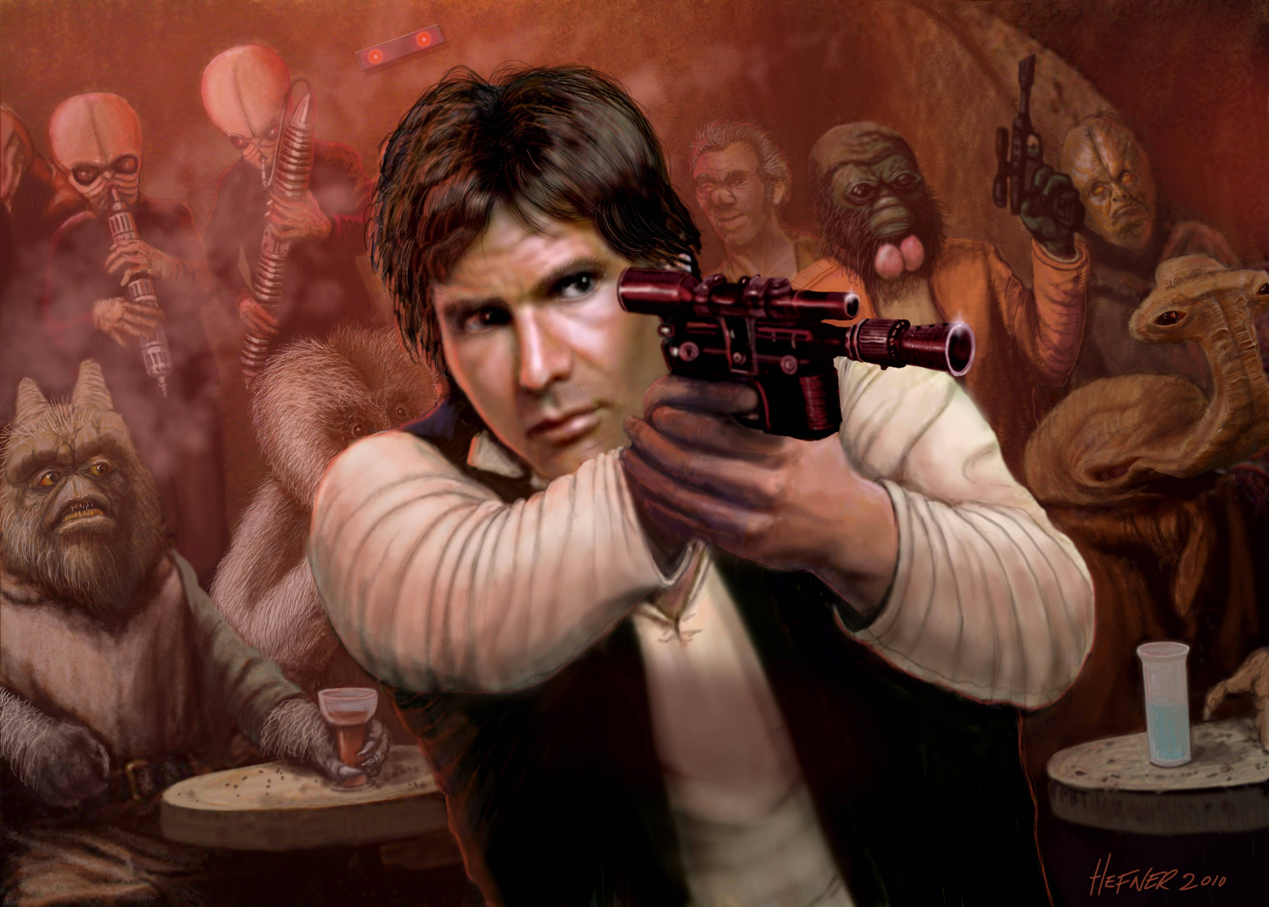 Description: A painting of a man holding a gun in front of a group of people with a bar in the background.