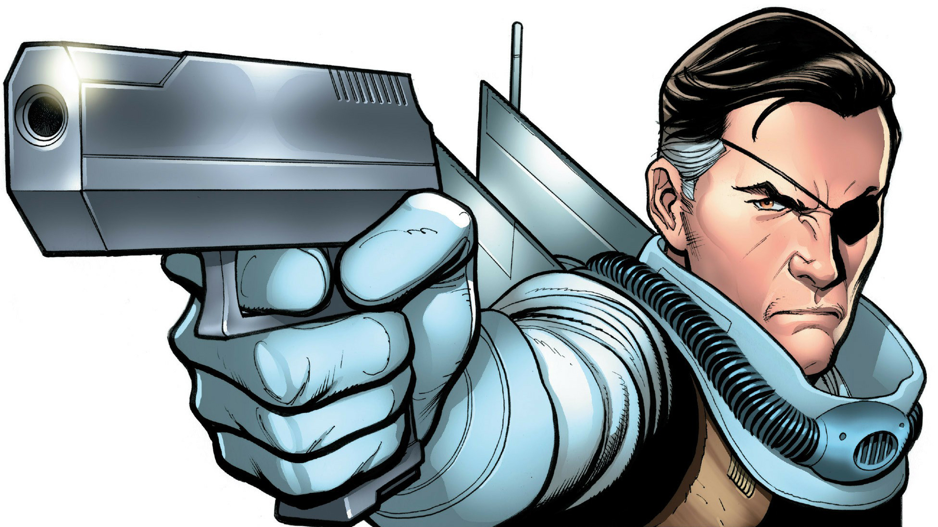 Description: A man holding a gun and pointing it at the camera with a serious look on his face and face.