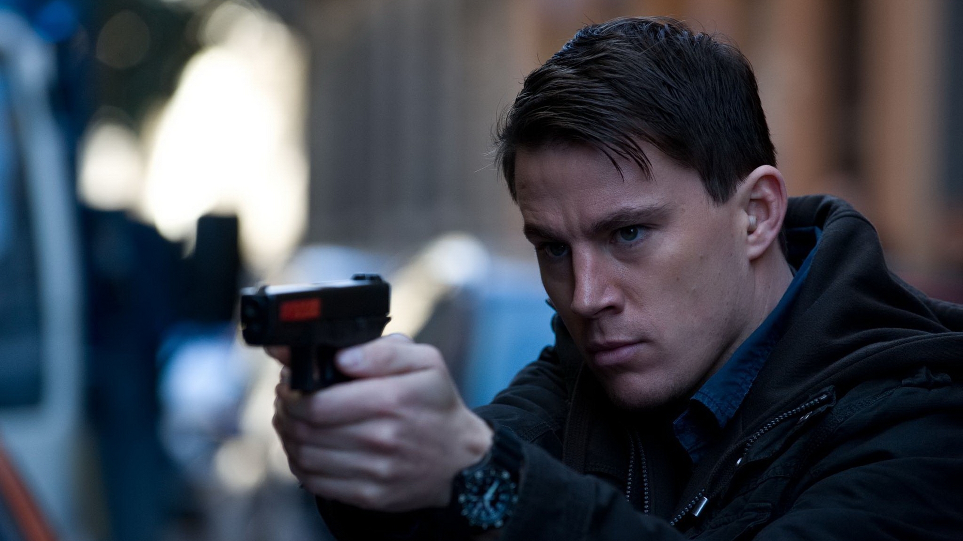 Description: A man holding a gun in his hand while looking at the camera with a serious look on his face.