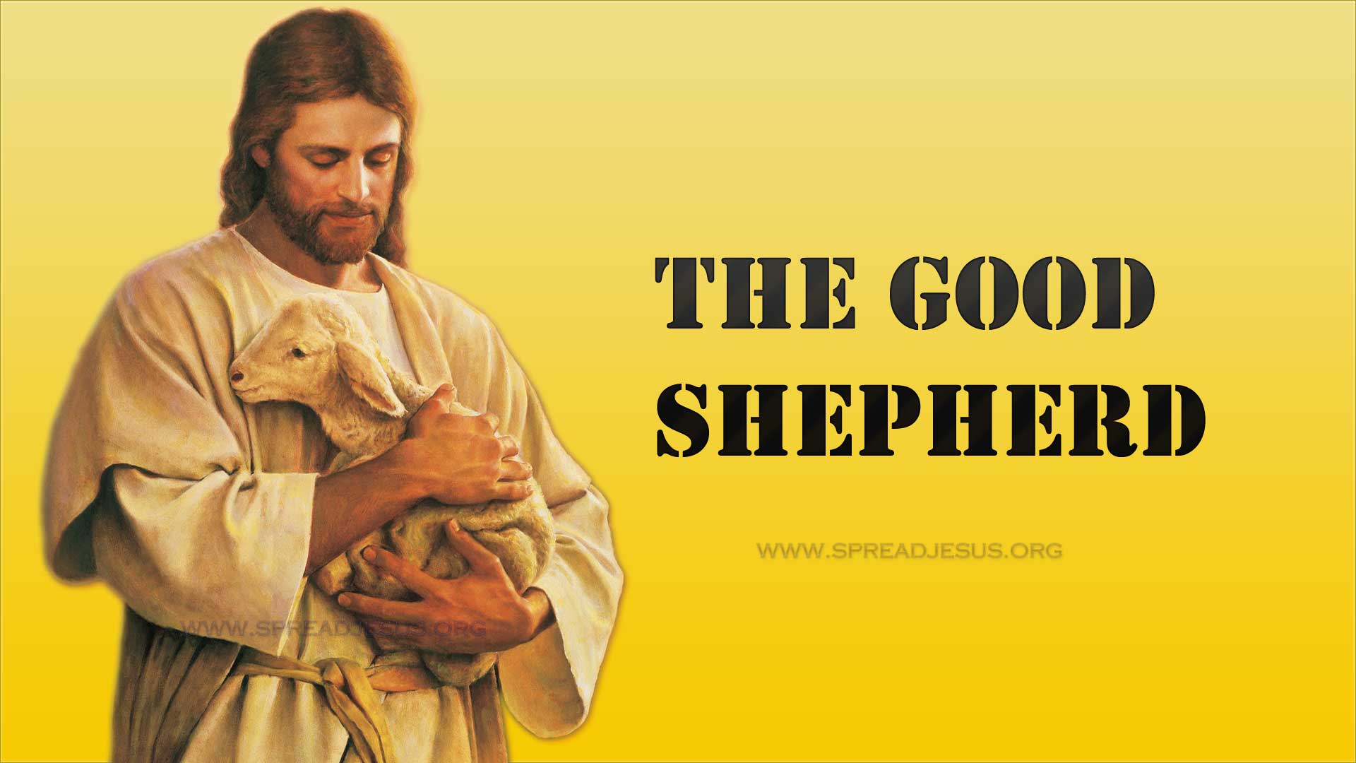 Description: A man holding a lamb in his arms with the words the good shepherd above it and a yellow background.