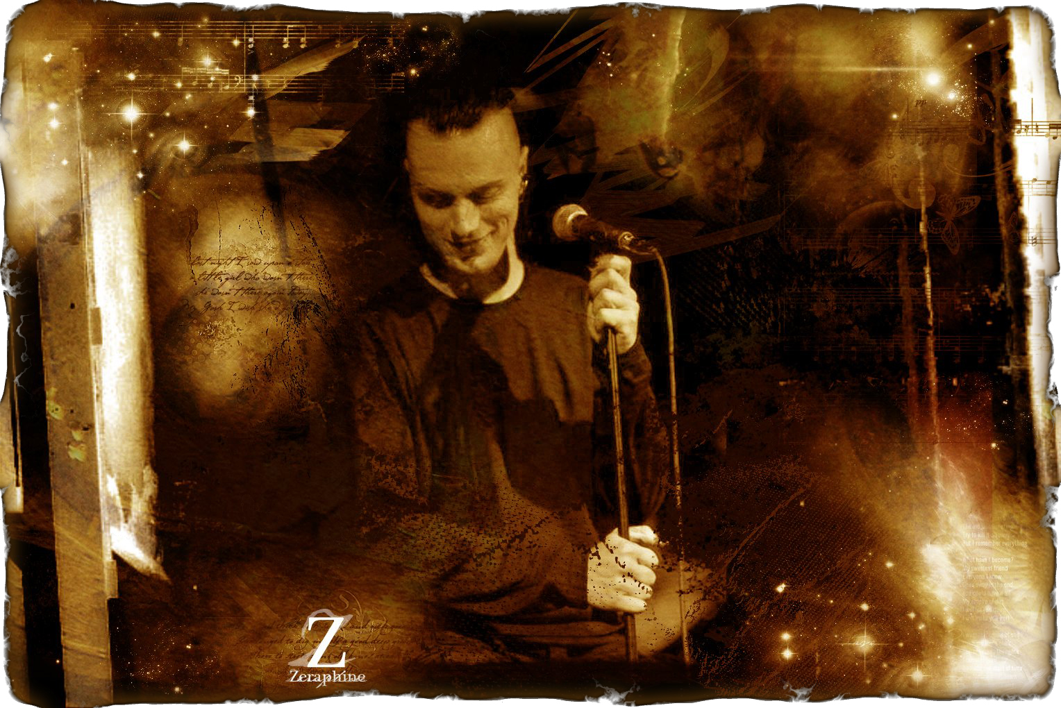 Description: A man holding a microphone in his hand while sitting down in front of a microphone stand with a dark background.