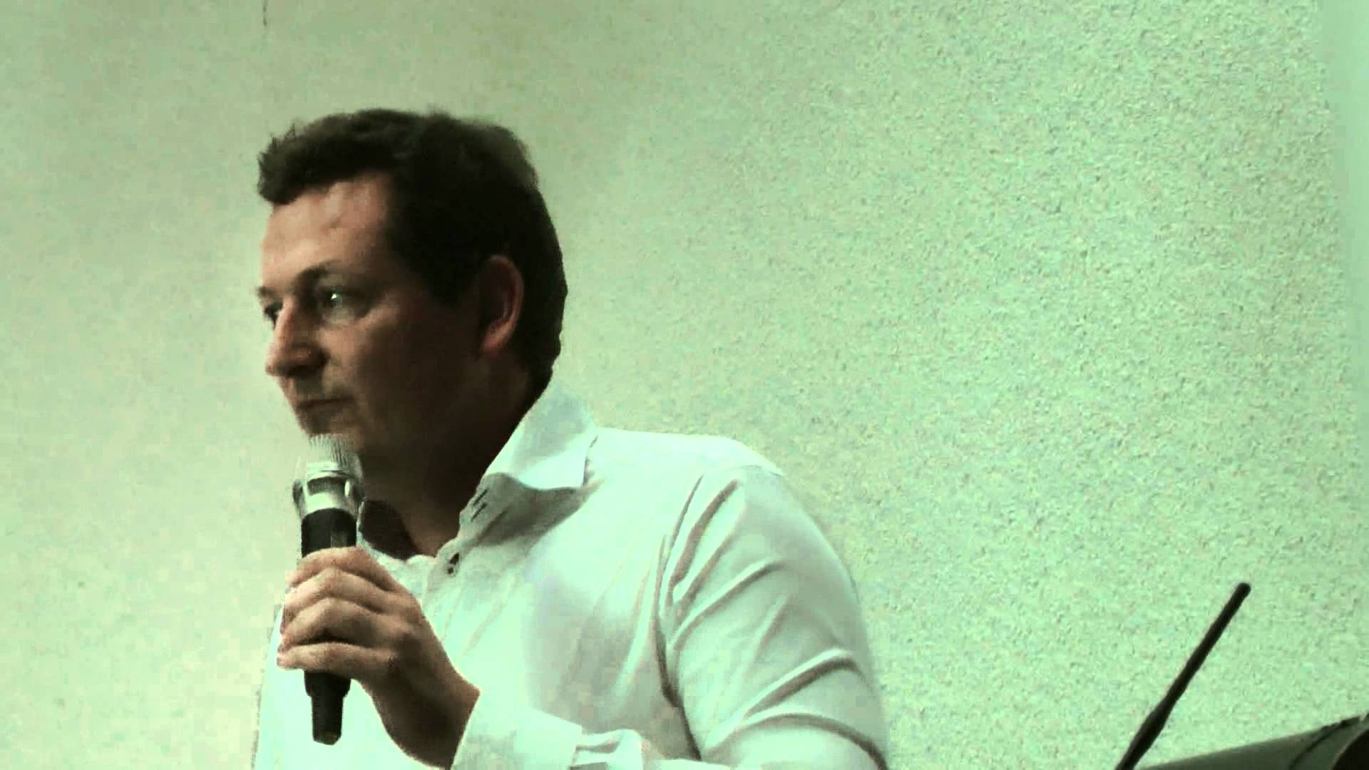 Description: A man holding a microphone in front of a microphone stand with a speaker in front of him and a speaker on the side of the wall.
