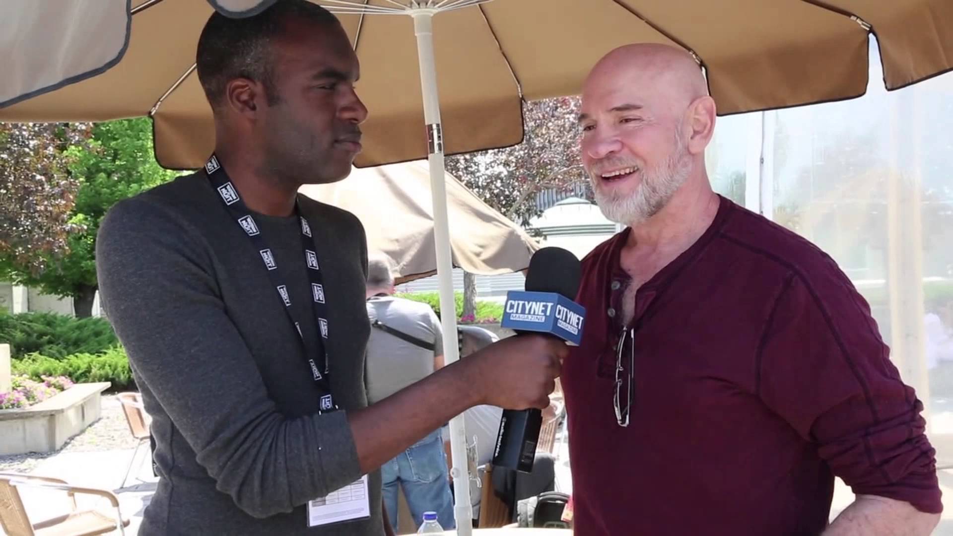 Description: A man holding a microphone talking to another man under an umbrella outside of a building with a large umbrella.