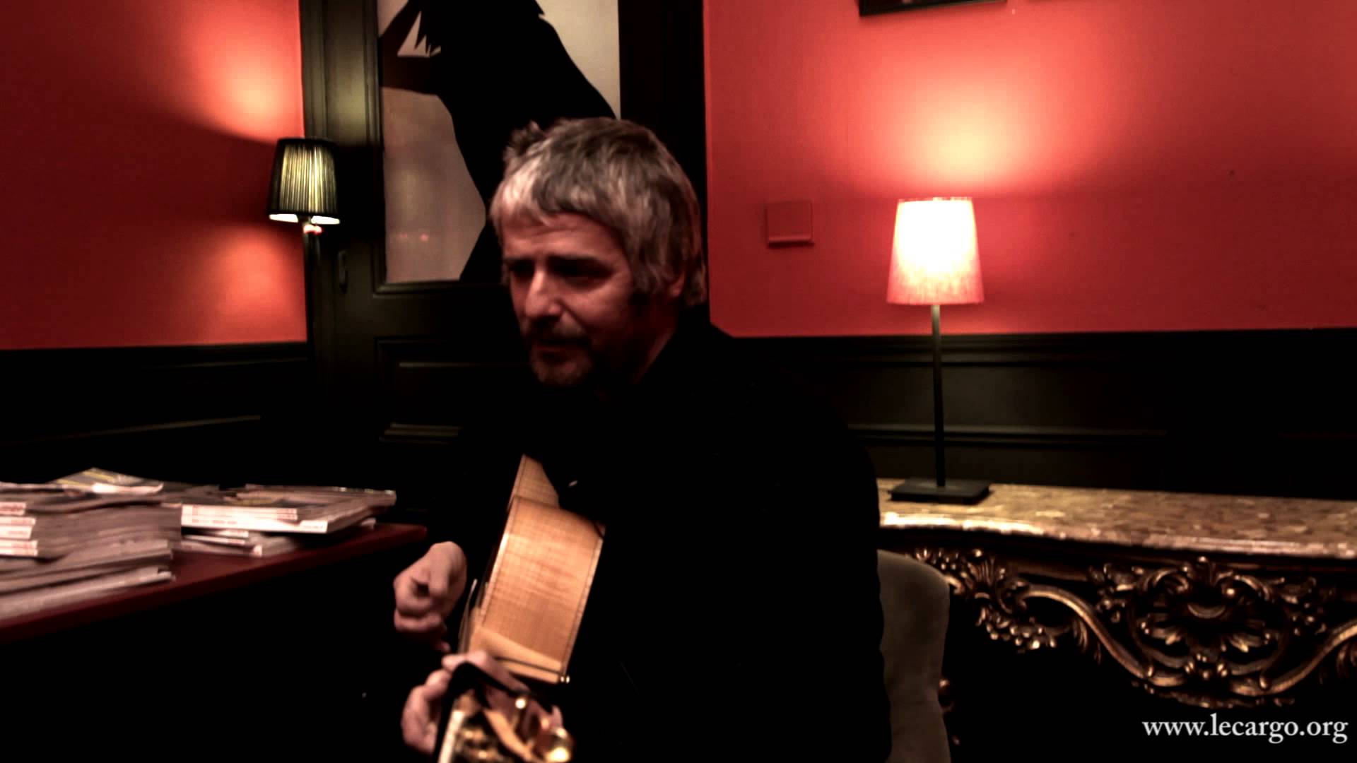 Description: A man holding a piece of paper in his hand in a room with red walls and a table with a lamp.